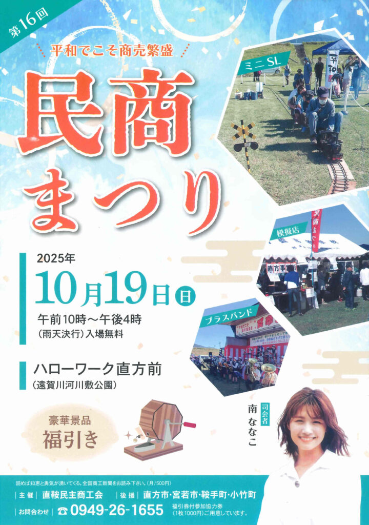 民商まつり やります! News & Information 2025.08.212025.11.04 2025年10月19日日曜日 第16回 民商まつりです。会場は直方ハローワーク前(遠賀川河川敷公園)お近くの方、遊びに来てください。豪華賞品 福引あります! おかげさまで、無事に民商まつりを行う事ができました。